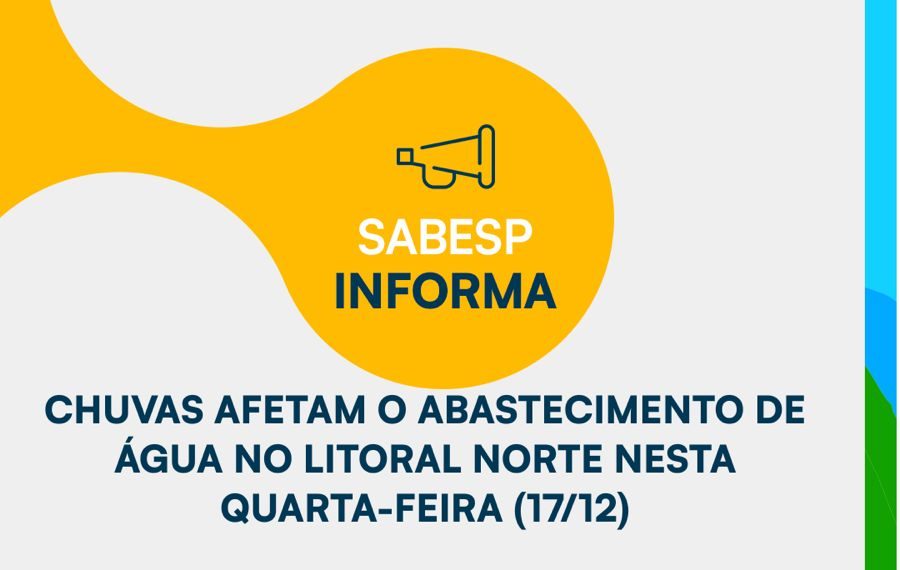 A Sabesp informa que as fortes chuvas que atingiram a região nesta quarta-feira (17) afetaram a operação das Estações de Tratamento de Água (ETAs). O abastecimento pode ser impactado nas seguintes localidades: Ilhabela (ETAs Água Branca e Bexiga), Caraguatatuba (ETA Massaguaçu), São Sebastião (ETAs Boiçucanga e São Francisco) e Ubatuba (ETA Carolina).