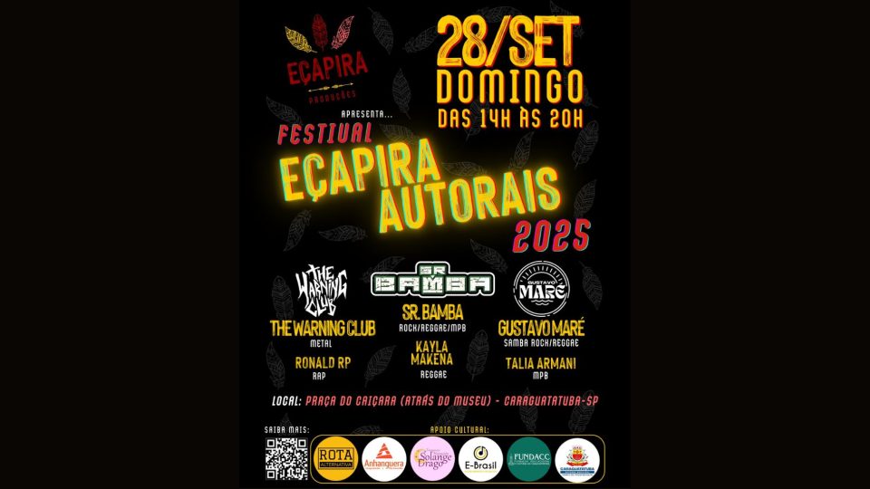 A Praça do Caiçara, no Centro de Caraguatatuba, recebe neste domingo (28/9), das 14h às 20h, o Festival Eçapira Autorais 2025, com apresentações musicais de artistas locais e exposição de diversos tipos de artesanato. A entrada é gratuita e o evento é aberto ao público.