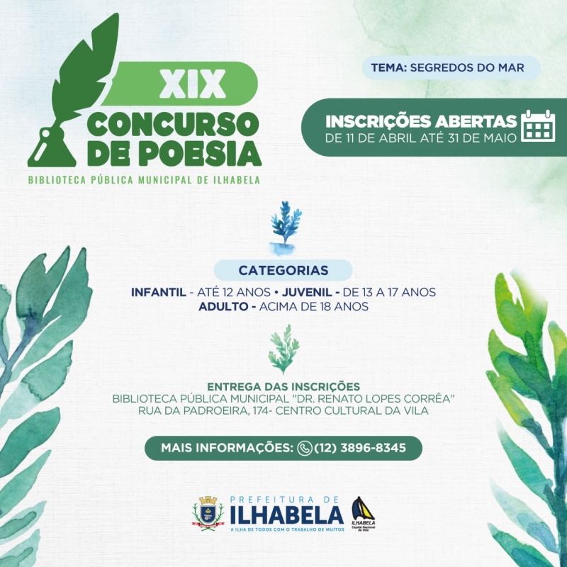 A Prefeitura de Ilhabela, por meio da Secretaria da Cultura e da Fundação de Arte e Cultura de Ilhabela (Fundaci), está com inscrições abertas até o dia 31 de maio para o 19º Concurso de Poesia.