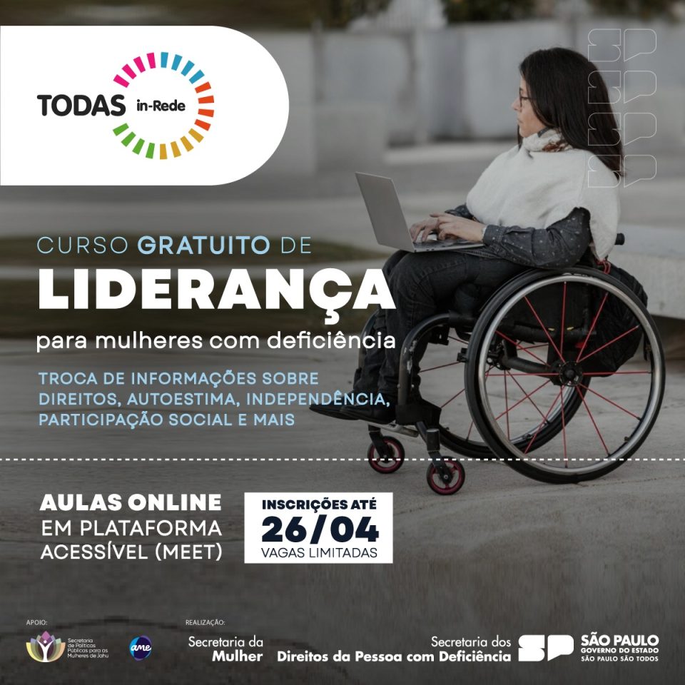 A Secretaria de Estado dos Direitos da Pessoa com Deficiência (SEDPcD), com o apoio da Secretaria de Estado de Políticas para a Mulher (SP Mulher), abriu, nesta quinta-feira (28), as inscrições para o curso gratuito de Liderança e Empoderamento Feminino do programa TODAS in-Rede, que disponibiliza aulas online para mulheres com deficiência com temas que abrangem o empreendedorismo e os direitos femininos. As vagas são limitadas e as inscrições vão até 26 de abril.