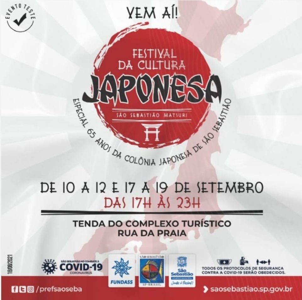 Marcando a retomada dos eventos turísticos e a fomentação da economia no município, a Prefeitura de São Sebastião, por meio da Secretaria de Turismo (SETUR) e da Fundação Educacional e Cultural “Deodato Sant’Anna” (Fundass), realizará, de 10 a 12 e de 17 a 19 de setembro, o primeiro evento-teste Festival da Cultura Japonesa “São Sebastião Matsuri”. Neste ano, a Colônia Japonesa de São Sebastião celebra 65 anos de existência.