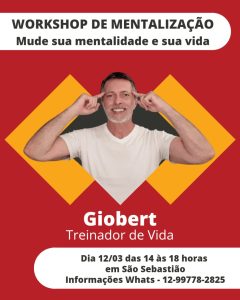 O influencer e treinador de vida, Giobert Mendes Gonçalves Junior, de São Sebastião, promove neste sábado (12) seu 1º Workshop de Mentalização presencial. O evento acontece a partir das 14h, na Casa Camargo, localizada na Alameda dos Badejos, nº 60, no Arrastão, região central do município. Todos os protocolos sanitários da Covid-19 serão mantidos durante o encontro, que tem encerramento às 18h.