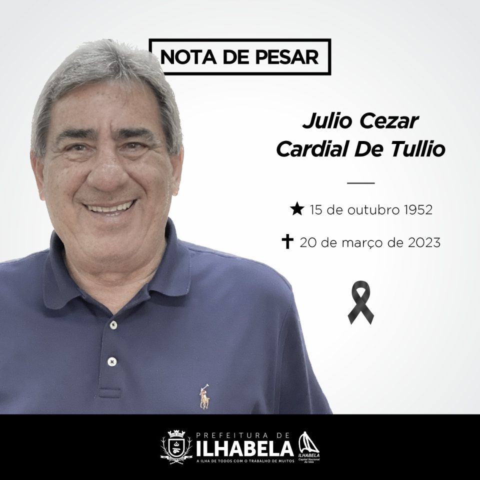 A Prefeitura de Ilhabela informa com pesar o falecimento do secretário municipal de Governo, Julio Cezar Cardial De Tullio, nesta segunda-feira, dia 20 de março de 2023. Que Deus conforte toda família!