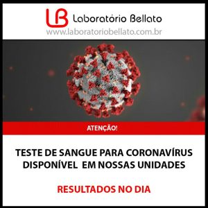 O laboratório Bellato informa que a coleta de sangue para o teste do Coronavirus pode SIM ser feita no laboratório, das 7h às 16h de segunda a sexta, e sábado das 7h às 10 (horários da coleta de sangue). Há também a possibilidade de fazer a coleta de sangue domiciliar, com cobrança da taxa de deslocamento.